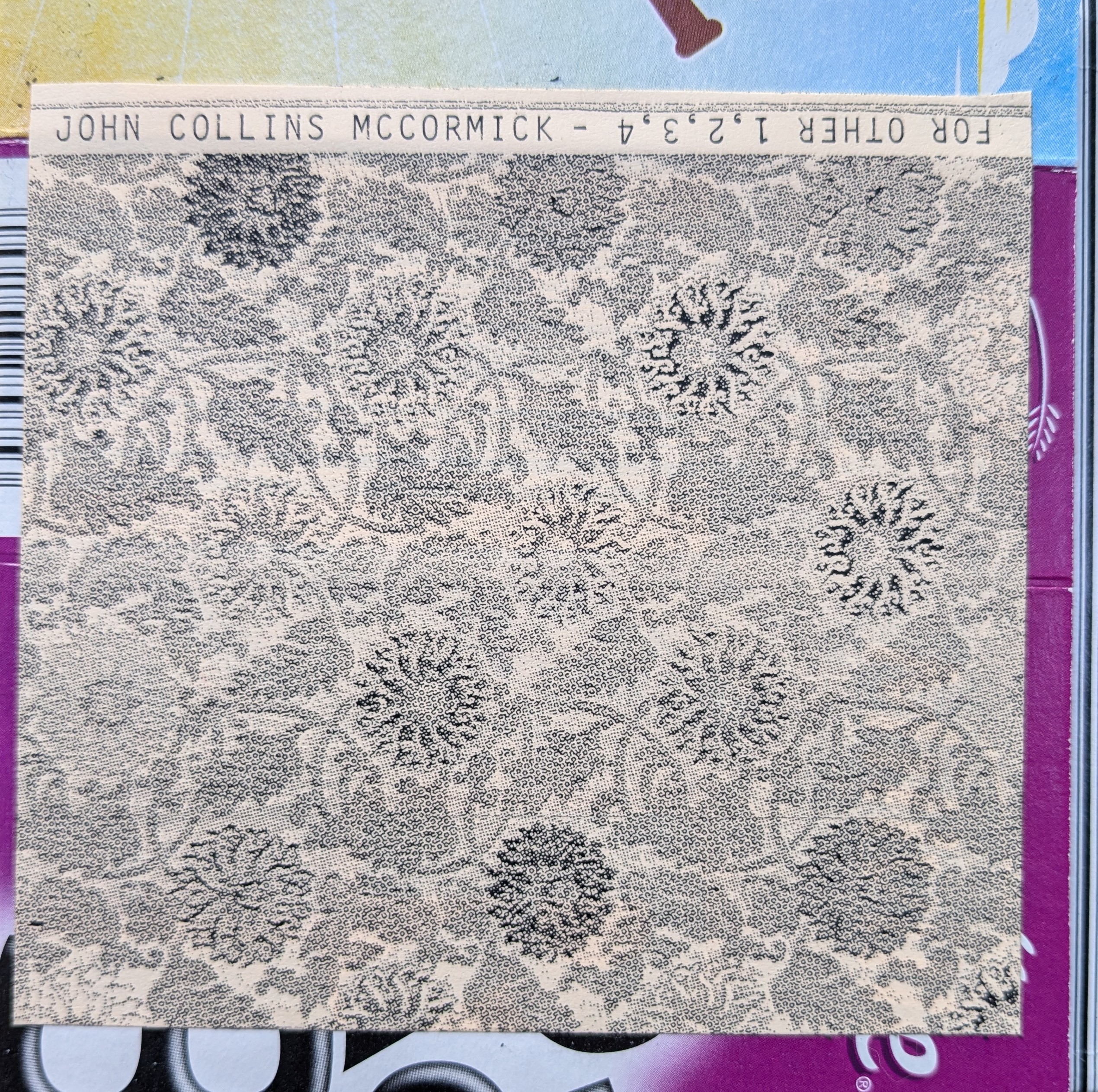 For the most part, “range” is overrated. An artist’s body of work is just as impressive when it’s laser-focused as when it’s eclectic. In the singular case of John Collins McCormick, however, focus and eclecticism aren’t different things at all. Each radically unique release he puts out simply documents a new approach to the same open-minded exploration of sound itself. Even then, you’d be hard pressed to find two entries in his discography more contrastive than Your Money Your Life and For Other 1, 2, 3, 4 (both of which, fittingly, dropped on the same day). The former, comprising a single half-hour piece, is McCormick’s most direct invocation of harsh noise tropes; Finally Tall Enough for My Age, I Grew Deeper from last year’s tape batch certainly made use of caustic textures, but it resided more in the area of the passive detachment of data sonification. This, on the other hand, is carefully composed, emotional and human and even warm despite its obvious digital origins. Not unlike Veidrik’s HAZARDAJ, software output is just the paint in the palette, so the actual proceedings are loose and gestural—I could see even the analog purists enjoying this. McCormick anchors his crackling distortion swarms with a sighing tension-and-release structure and tactile snippets, the maelstrom culminating in a stripped-down coda.