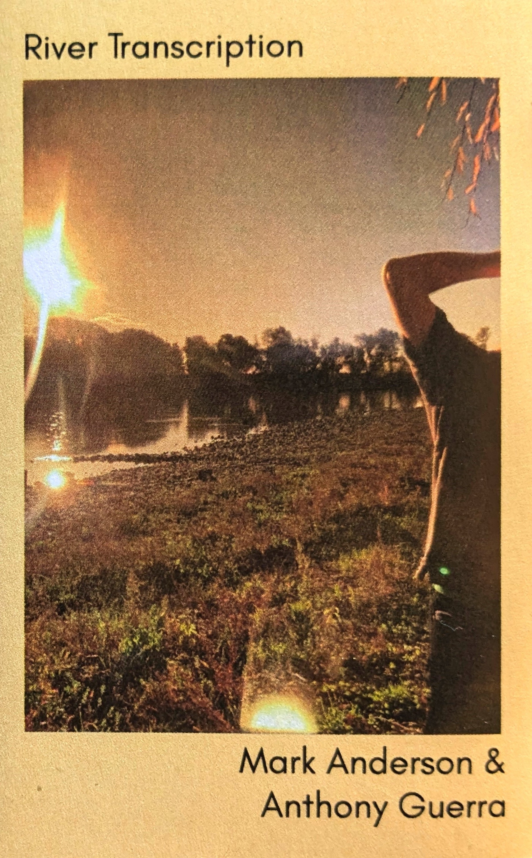 Certain duos were always meant to be. Mark Anderson and Anthony Guerra have been crucial parts of Australia’s off-kilter underground scene for the better part of this century so far, whether lending their shambolic instrumental talents to various avant-rock efforts both together (Mysteries of Love) and separately (Greymouth, Love Chants) or holding it down in even more abstract contexts (Guerra’s improvised meetings with Joel Stern are eternal favorites of mine). Their newly minted collaboration, which seamfully melds those two realms of interest, found its footing with the spellbinding Earth Diffusion CD on Index Clean last year. The renowned Melbourne text-sound source was a perfect platform for the pair’s surreal voice-based sketches, each fleeting collage a lush universe of moans, groans, and psychedelic undertones. Stationed on the opposite side of the globe, Stockport’s Regional Bears has a proven track record of letting promising projects shine on longform canvases, so I was excited by the prospect of a continuous forty-minute piece from these musicians, and the only thing River Transcription fails to do is disappoint. Recorded in a single session on the shore of the Tukituki river, the sun-bathed suite seems to melt time; when my deck stopped I thought something was wrong with the tape, because there was no way it was over already. And yet there’s not a moment of hustle or hurry to be found throughout the drowsy meditation. Anderson and Guerra are content to be mere features in a much larger soundscape, bleary-eyed rivermen whiling away an amber autumn day as the current ambles by. Stones slide and scrape, breezes rush and birds sing, a guitar briefly noodles before deciding it would rather bask in the grass, shouts ring out from across the water: time to turn in.