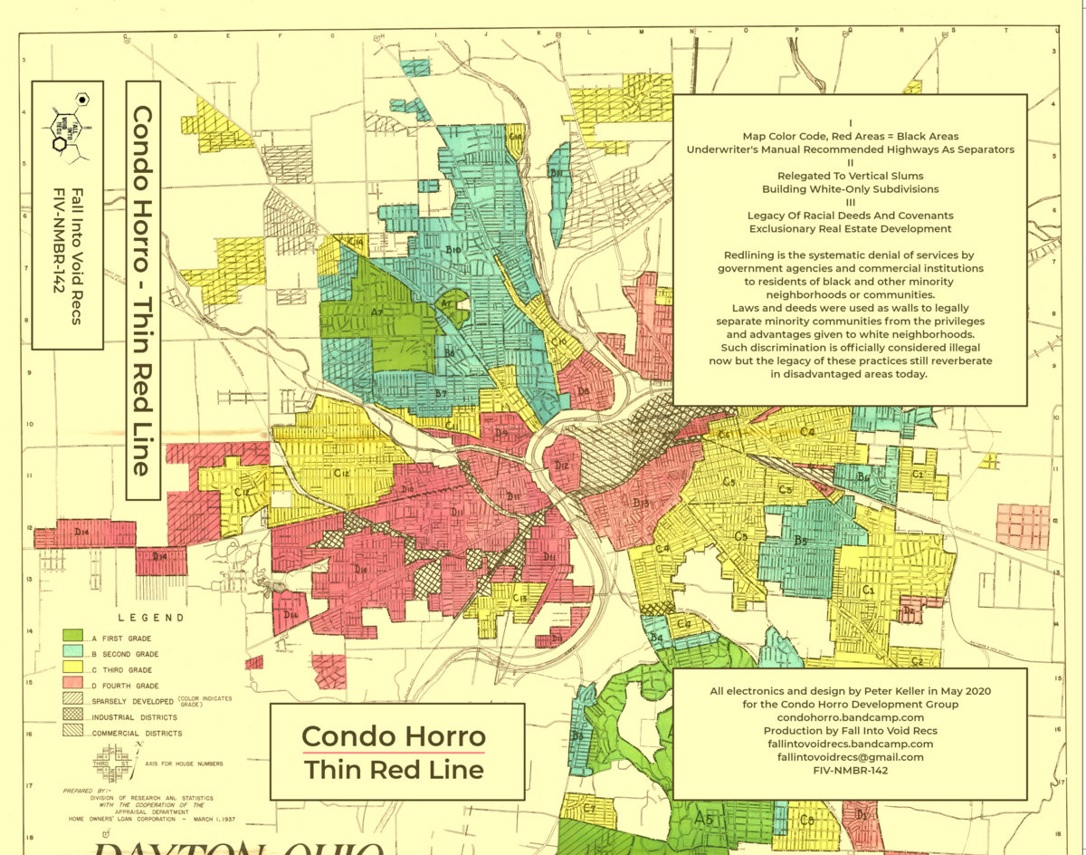 There are very few noise artists that provide a double-dose of eclecticism and quality across their various projects at the same intensity as Peter Keller. The Seattle stalwart has previously graced the pages of Noise Not Music with his wildly disparate Bacillus and Dirac Sea outlets (the former is focused on brash, dirty, abrasive harsh noise with themes of disease and contagion, while the latter transposes wall noise textures to a realm of infinite cosmic beauty), but until now I was unfamiliar with Condo Horro, another wall alias that seems to be almost entirely focused on examining themes of gentrification, segregation, redlining, and other forms of the grotesque racism that plagues urban planning to this day. The ambitious Thin Red Line box set has nothing to do with Terrence Malick’s 1998 war-epic and everything to do with the titular process, which is directly defined on the cover of the release as “the systematic denial of services by government agencies and commercial institutions to residents of black [sic] and other minority neighborhoods or communities.” As we’ve seen from the past decade alone, the relatively restrictive conventions of the wall noise genre have paradoxically allowed a level of diversity and creativity to flourish among artists who work with them, and this release is just another example of those curious and fascinating implications. Conceptually, Thin Red Line couldn’t be more direct—the cover features a planning map of Dayton, OH (a city not too far from me, actually, and what I think may be Keller’s home town), the aforementioned definition, and heavily expository track titles—but the same directness doesn’t seem to be present in the relationship between that concept and the music. At least, not at first. But just like the countless Dirac Sea albums I’ve heard, these walls take time to fully unfurl, time that often extends beyond their actual run times. The opening two tracks on the C10 blast with incendiary fury, while the following pair on the C30 draw back a bit, eventually revealing that they are not at all homogeneous, instead borrowing a linearity of progression from the field recordings that are subtly incorporated, occasional artifacts buried in the outskirts of the stereo field constantly expanding the breadth of the seething static. “Legacy of Racial Deeds and Covenants” is almost achingly stagnant and detached, a consuming yet understated portrayal of the ever-unutterable, while closer “Exclusionary Real Estate Development” combines punishing distortion with a profound emptiness that stubbornly refuses to be filled. Such an abstractly symbiotic relationship between concept and content is what makes Condo Horro, and Keller’s work in general, as magnetic and valuable as it is.