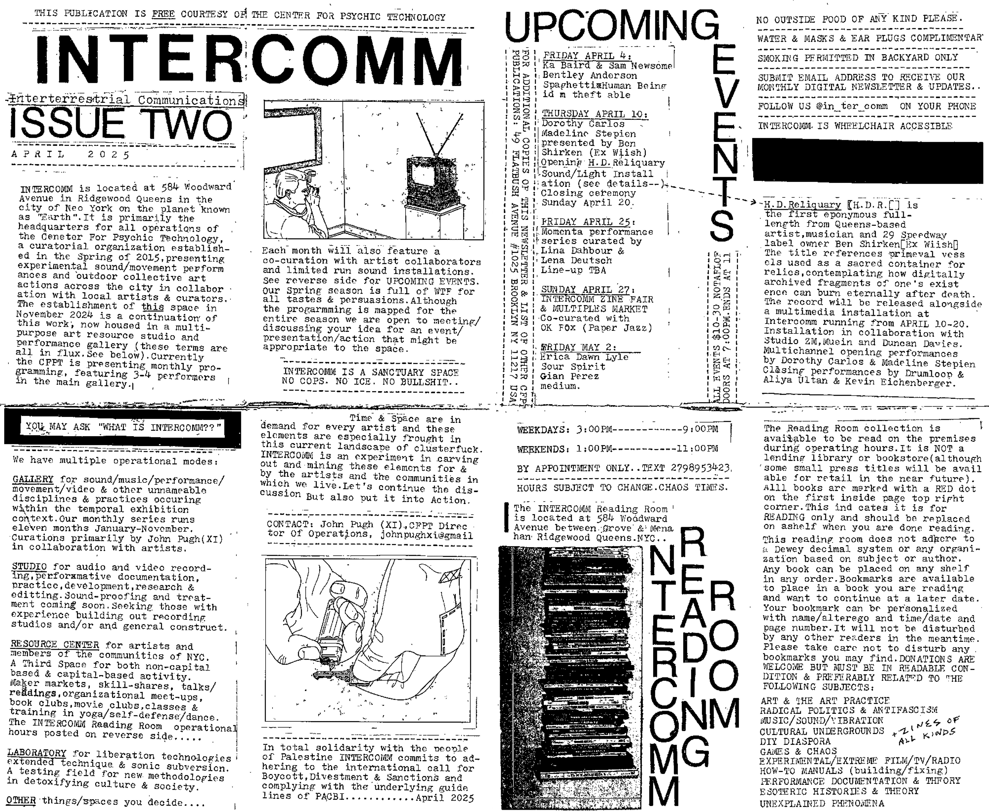 If you’re as picky as I am, the state of weirdo venues in New York leaves a lot to be desired. Most gigs I’ve attended have either been at overloud, underlit, beer-soaked bars or underloud, overlit, too-clean galleries, both of which have financial advantages for those who take up the often thankless task of booking. Then there are the rent-outs, unrelated sites that make their digs available for use on evenings and weekends, inevitably with hefty overhead. And there’s always the option of someone’s cramped studio or a risky outdoor post-up. But scattered few and far between are the truly dedicated spaces, which tend to not last very long (an exception being the Living Gallery, alive and kicking since 2012). All of this is why it’s so exciting to have something like INTERCOMM. Their