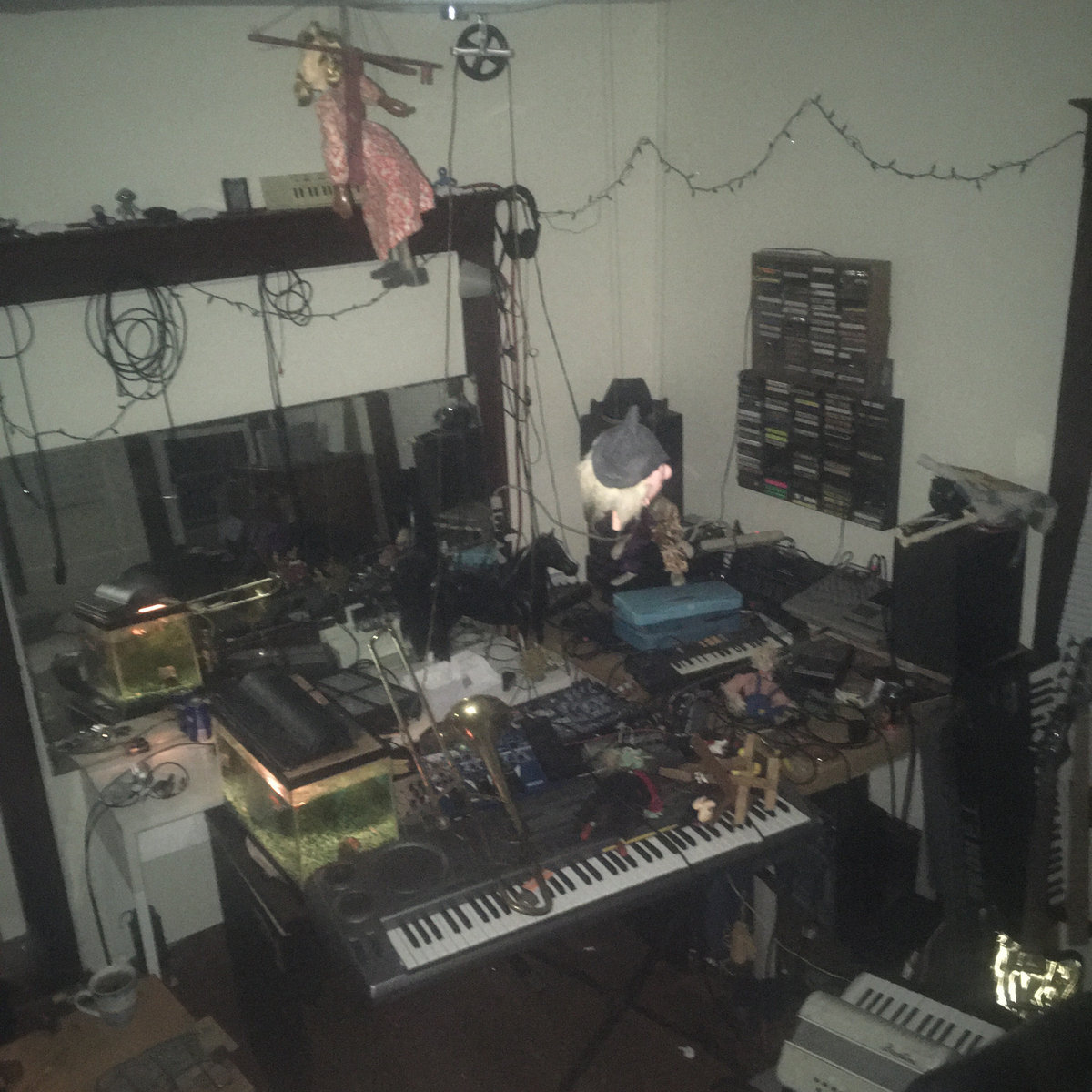 Even for someone as woefully, archetypally Gen-Z as yours truly, whatever the fuck is going on over at the music.com Bandcamp page is pretty damn indecipherable. However, a (relatively) more coherent silver lining to the almost grotesque cesspool of stale internet post-irony has been a set of two albums from a mysterious collective of musicians referred to only with blanks: January’s . featured _____ ______ and ___ ____ collaborating on a dusty mess of electroacoustic tangle and tedium, and for ___ Quintet the pair is joined (I think—either _____ ______’s last name gained a letter or they hyphenated it with someone else’s) by three more companions wielding thrift store guitars, scuffed horns, no-input mixing boards, and cracked plastic keyboards to generate an even more complex racket of basement bunkum. While much of . reminded me of the elusive, warbling beauty of Sunshine Has Blown (a comparison I unfortunately do not get to make very often) with its gestural use of tape blurring, loose string plods, and overall spellbinding lethargy, the Quintet is unsurprisingly more active and immediate. Tracks like “&#rJ$GT}%Y86*@A8” are good abbreviated representations of the bizarre sound the five participants conjure: noodling flurries both near and far; overlapping, even conflicting layers; an inexplicable forward inertia; and an atmosphere that’s not quite claustrophobic but definitely not spacious either. I suppose listening to ___ Quintet transports one, at least in part, to that cluttered room pictured on the cover (at least we don’t have to physically be there; God knows what the smell is like) to become just another piece of an endless pile of junk, simultaneously contained and catalyzed by the confines of the dreary grey walls.